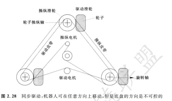 在室內(nèi)移動(dòng)機(jī)器人應(yīng)用中,同步驅(qū)動(dòng)結(jié)構(gòu)(圖2.28)是一種流行的輪子裝配,也是 一個(gè)令人很感興趣的結(jié)構(gòu)。因?yàn)樗m然有3個(gè)驅(qū)動(dòng)和操縱輪,可是總共只用了2個(gè)電機(jī)。一個(gè)平移電機(jī)設(shè)置3個(gè)輪子一起的速度; 一個(gè)操縱電機(jī),使所有輪子繞著它們 各自的垂直操縱軸一起旋轉(zhuǎn)。但要注意的是,輪子是相對于機(jī)器人的底盤受操縱的, 所以,沒有直接方法重新設(shè)定機(jī)器人底盤的方向。實(shí)際上,由于凹凸不平輪胎的滑動(dòng),在整個(gè)時(shí)間里底盤方向一定會(huì)漂移,造成旋轉(zhuǎn)的航位測定誤差。