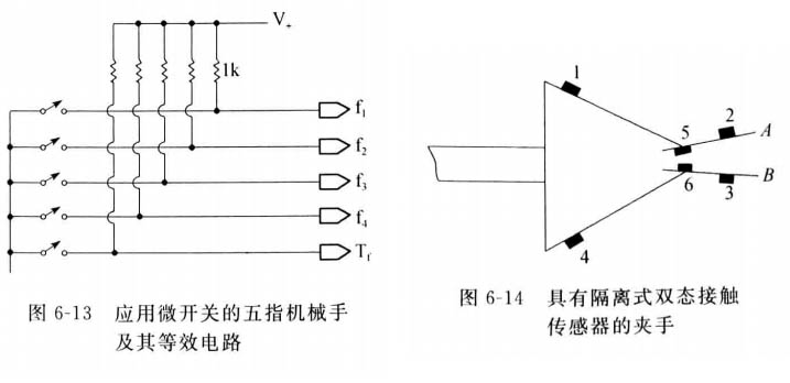 圖6-13表示一個(gè)接到機(jī)械手的接觸開關(guān)系統(tǒng)。這 個(gè)機(jī)械手具有整體式手掌,各個(gè)開關(guān)共用一條地線。 這時(shí)的機(jī)械手處于空載狀態(tài),五個(gè)微開關(guān)均打開,因 而放大器的輸人端均為高電位,即處于邏輯“1”狀 態(tài)。如果有任一個(gè)微開關(guān)因手指接觸到物體而接通, 那么就送一個(gè)邏輯“0”至放大器。