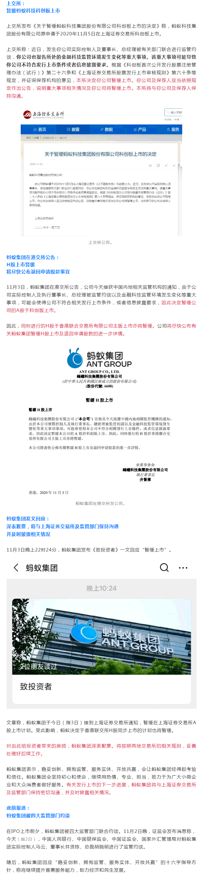 港交所也發(fā)布公告稱,暫緩螞蟻集團H股上市,并表示將盡快公布有關螞蟻集團暫緩H股上市及退回申請股款的進一步詳情